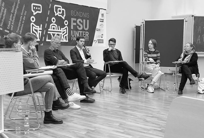 Immer wieder betont das Präsidium, unverschuldet in Not geraten zu sein und kurzfristig handeln zu müssen. In einer von dem Bündnis FSU unterfinanziert organisierten Podiumsdiskussion, an der auch Landtagsmitglieder teilnehmen, wird dieses Narrativ allerdings in parteiübergreifender Einstimmigkeit infrage gestellt.